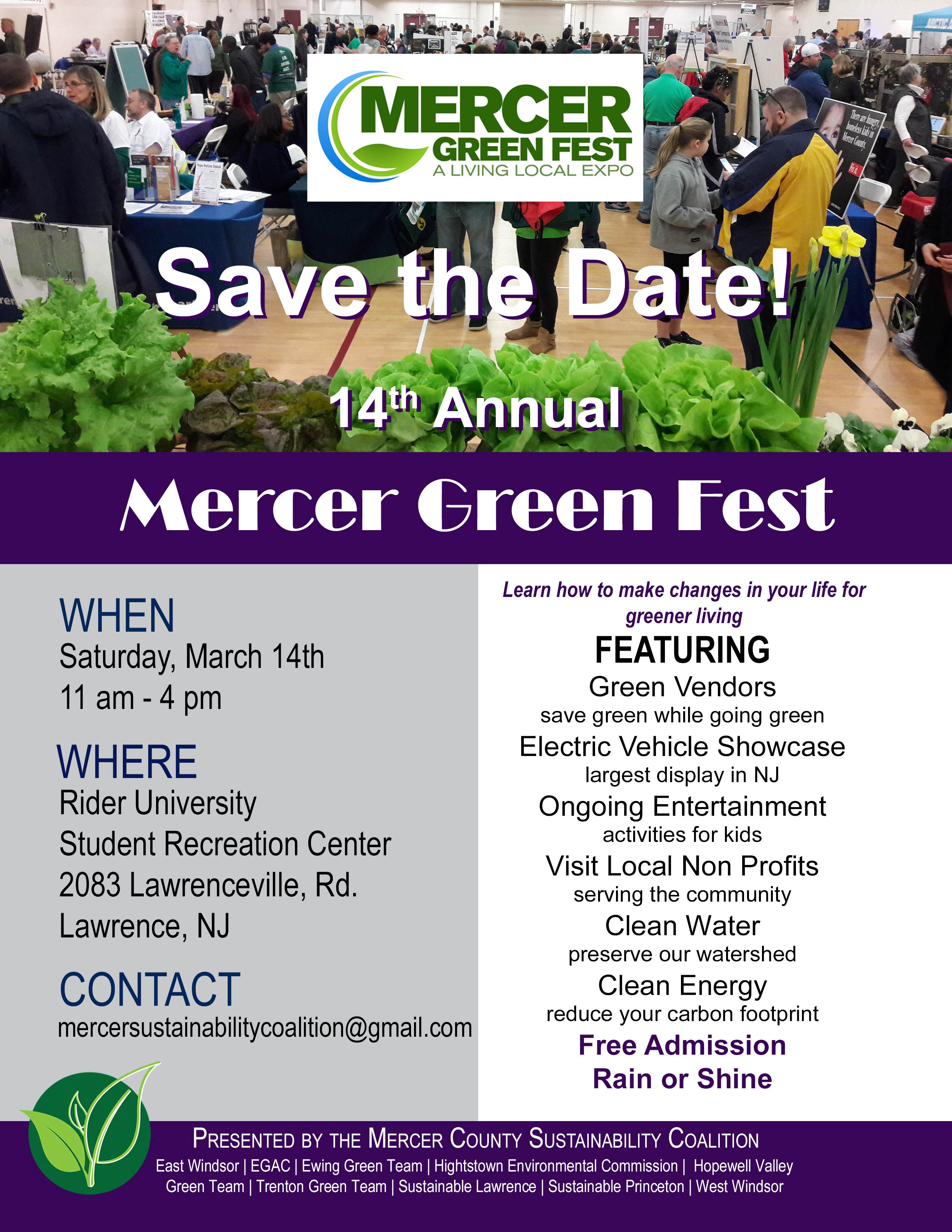 The Mercer Green Fest is organized by the partners of the Mercer Sustainability Coalition: the Ewing Green Team, the Hopewell Valley Green Team, Lawrence Environmental Resources & Sustainability Green Advisory Committee (ERSGAC), Sustainable Lawrence, Sustainable Princeton, the West Windsor Environmental Commission, and the Mercer County Office of Economic Development and Sustainability.