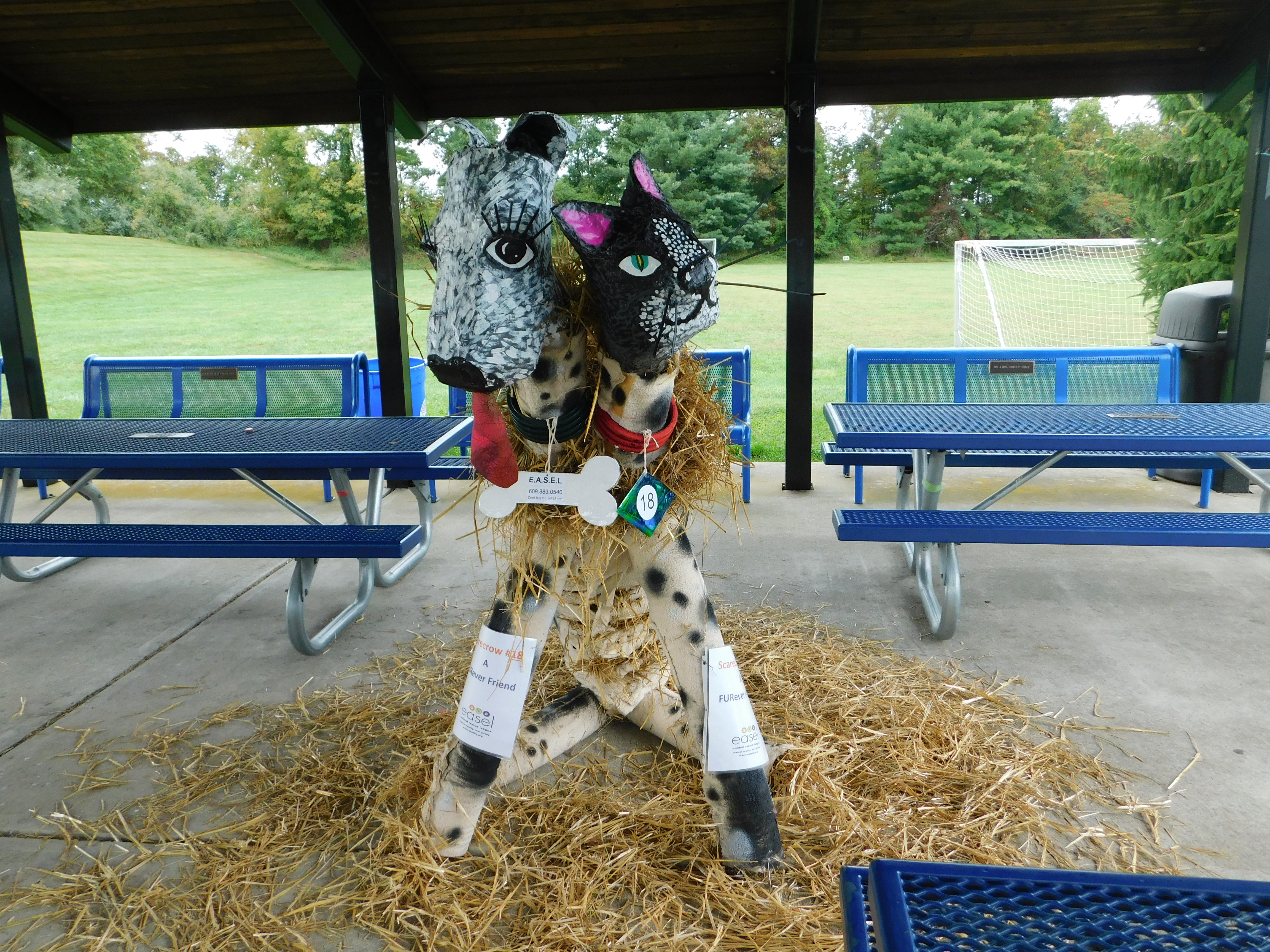 The heads of the scarecrow were crafted from plastic piping and wire mesh. Once the basic heads were formed, the artist used newspapers for a paper mâché technique to create definition and depth for the dog and cat heads. Once that was done, she painted the heads of the dog and cat. The whiskers of the cat and the eyelashes of the dog were created using zip ties. The tongue of the dog was created by using material from a discarded basketball that she found in a creek during a hike. The collars of the dog and cat were created using discarded PVC piping. The overall body was created from scrap wood, an old ironing board, engine parts, wires mesh, plastic mesh, and plastic piping. The body, head and tail were then wrapped in a blanket. The blanket was spray-painted, and parts of the body were also covered in hay.
